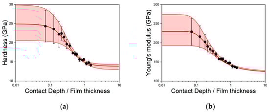 where Hs and Hf are the hardness of the substrate and the film, respectively, t is the film thickness, and k is a coefficient depending on the nature of the film deformation. To approximate the dependence of Young’s modulus, the empirical dependence proposed by Doerner and Nix was used [46,47], where: