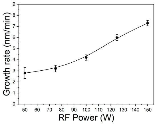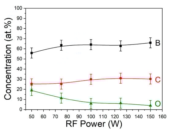 The influence of RF power supplied to the B4C target on the composition and properties of the as-grown BCx films was studied in this work. The thickness of the prepared films was 200–300 nm. Figure 2 shows the dependence of film growth rate on the B4C target sputtering power for series A. The growth rate of the films increased with increasing RF power (up to 7.3 nm/min at 150 W), which is typical for ion-plasma processes [20].