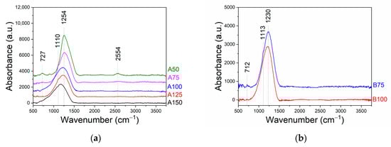 FTIR-spectroscopy was used for the study of chemical bonding. According to literature data, the spectrum of polycrystalline B4C has two bands near 1090 cm−1 (Eu) and 1580 (A2u) that are associated with vibrations of the icosahedron and chains connecting the icosahedra to each other, respectively [54,55,56]. The IR spectrum of amorphous boron carbide has a band at 1100 cm−1, which shifts to more than 1200 cm−1 for carbon-enriched a-B1-xCx films [32]. The absorbance bands associated with boron oxide appear in the IR-spectra at 1420 cm−1 (B–O stretching), 1280 cm−1 (B–O deformation), and 724 cm−1 (B–O deformation) [57]. The evolution of the FTIR spectra of the samples of series A is presented in Figure 4. The broad absorption bands with maximums in the region of 1152–1254 cm−1 are exhibited. With an increase of RF power applied to the B4C target from 50 to 150 W (Figure 4a), the maximum of the main band shifted to the region of low-frequency vibrations. This is apparently due to an increase in the proportion of B–C bonds. According to the EDX data, the concentration of boron and carbon rose with increasing power. The main peak of the A50 film spectrum can contain the contribution of B–O deformation vibrations that appeared at 1280 cm−1, which correlated with the EDX data on oxygen presence. Also, the FTIR spectrum of this sample contains a weak peak at 2554 cm−1 which corresponds to stretching vibrations of the B–H bond. The carbon-rich B75 and B100 samples prepared at dual magnetron sputtering (Figure 4b) also contain the broad absorption bands centered at 1230 and 1215 cm−1, respectively.