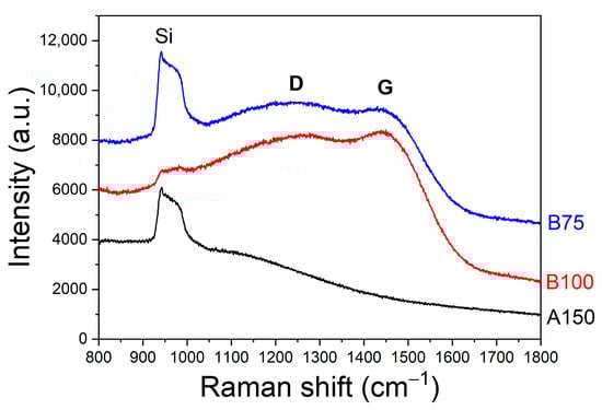The Raman analysis of all the deposited BCx thin films revealed no vibrational modes corresponding to boron carbide (Figure 5) [58,59]. The Raman spectra of the carbon-rich samples of series B contain two broad bands corresponding to D and G modes of the amorphous carbon phase [60,61]. Whereas the G band is associated with the E2g in-plane graphite Raman active mode, the D band is a breathing mode of the A1g symmetry of the sixfold ring. Moreover, these bands were shifted to the left; this shift can be observed for BCx films due to amorphization and a decrease in the size of carbon particles [12]. It should be noted that the low intensity and broadening of the D and G bands indicate a strong carbon disordering. Thus, the carbon-rich samples contain carbon clusters. As noted above, according to the B–C phase diagram, solubility of carbon in B4C does not exceed 20 at.%. Therefore, carbon at higher concentrations should be expected to separate into an additional phase. On the other hand, there is information that this limitation is removed in amorphous boron carbide [62]. Despite the excess of carbon content compared with the permissible but not much higher (C = 25–30 at.%), the Raman spectra of the samples of series A did not show any peaks except for the Si substrate.