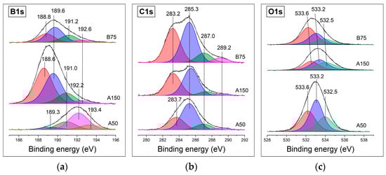 The analysis of B1s, C1s, N1s, and O1s the XPS spectra decomposed into components provides more detailed information on the chemical structure of the samples. The XPS spectra of the deposited films were recorded in order to reveal the effect of the power supplied to the RF magnetron using dual-target sputtering. It should be noted that XPS allows for the analysis of only ~9 nm of the film surface. XPS measurements were carried out without preliminary surface chemical etching or Ar+ sputtering to avoid preferential sputtering of B or C atoms. Therefore, the composition of the surface and the bulk material can be significantly different. Figure 6 shows the core level spectra of the B1s, C1s, and O1s of the A50, A150, and B75 films. The large width of XPS lines indicates a nonuniform chemical environment of boron and carbon atoms in the films. These peaks have complex structures and are superpositions of several components with different contributions.
