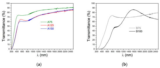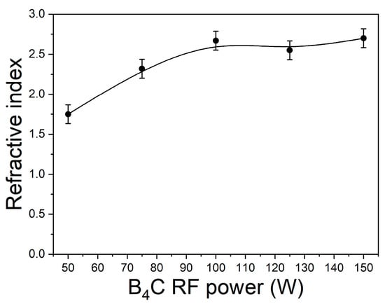 The refractive index of the samples of series A varied in the range of 1.75–2.91 (Figure 7) and increased with increasing B4C target power. The rise of the refractive index is, apparently, associated with an increase in the proportion of B–C bonds in the films. The refractive index values of B75 and B100 films were equal to 2.43 and 2.62, respectively. Transmittance of the BCx film/fused silica structures was in the range of 60–75% in the visible region of spectra and increased with the decreasing B4C target power (Figure 8). Carbon-rich The BCx films exhibited a redshift of the absorption edge with increasing carbon incorporation. This obviously deals with the absorbance properties of carbon, the concentration of which is higher at higher power as was shown in Table 3. The optical band gap Eg was estimated as a result of absorption edge processing according to the Tauc law [73]. The Eg value decreased from 2.8 to 2.1 eV with increasing B4C target power. The lowest band gaps equal to 1.4 and 1.1 eV were reached for the B75 and B100 samples, respectively. These results are in good agreement with the literature data [20,74].