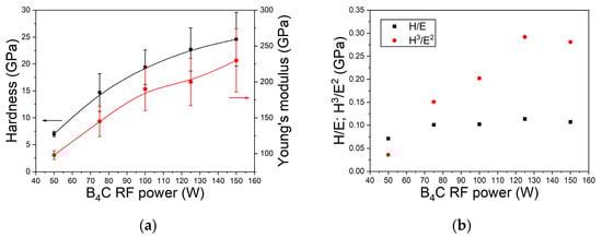 Dependences of (a) hardness (black line), Young’s modulus (red line), and (b) the elasticity index H/E and plasticity index H3/E2 of samples on B4C target power (series A).