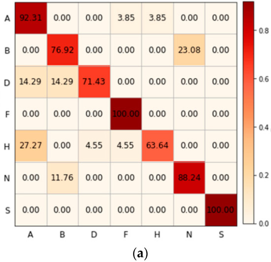 Third, on the test set of the EMODB database, it is noted that the emotions Boredom (B) and Neutral (N) are easily confusing pairs, so do Happiness (H) and Anger (A). On the test set of the CASIA database, it is noted that the emotions Fear (F) and Sadness (Sa) are easily confusing pairs. On the test set of the SAVEE database, emotions Anger (A), Disgust (D), and Fear (F) have a low-level recognition performance.