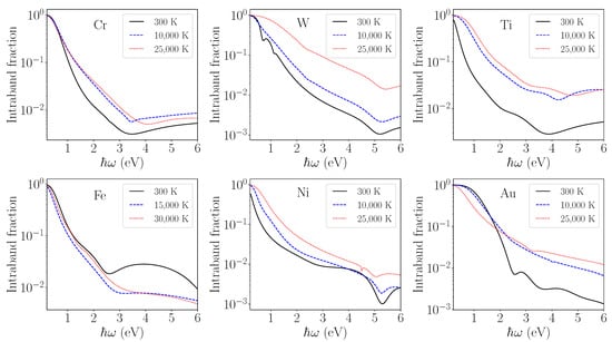 In Au, the d-block is completely filled and separated from the Fermi level by about 2 eV. This favors significant interband transitions from the d-band to the -band in the visible range for photon energy higher than 2 eV with intra--band transitions prevailing below 2 eV. This is almost the case for Ni as well, with the Fermi level being close to the top of the d-block and intraband transitions dominating in the infrared range. For Cr, W, Ti, and Fe, the d-states are partially filled, fostering interband contribution for a wide range of photon energies with the intraband transitions inside the d-band at low photon energies. The estimated relative contribution of the intraband process to the total optical transitions is presented in Figure 4. As expected, for photons in the infrared and near-infrared region at eV, intraband transitions are largely dominant.