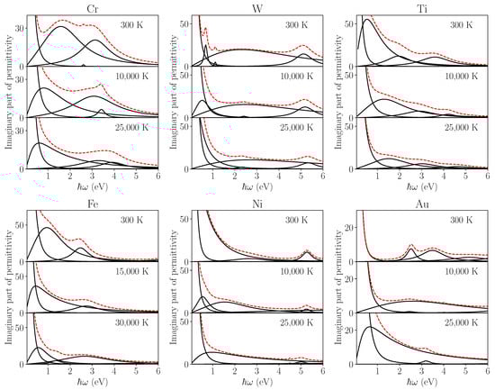 To understand other effects of a high electron temperature on permittivity, we analyzed the intraband and interband contributions separately. The contribution of intraband transitions to the permittivity generally increases with electron temperature, as shown in Figure 4. The high electron temperature also influences the relative strength of the interband transitions and shifts the interband transition energy, as can be seen from the evolution of the optimization parameters with temperatures from Table 3 and Table 4. This is also seen from Figure 5, where the contributions to the imaginary part of permittivity from different oscillators (order 0 to 4) are plotted separately. Different terms can thus be easily identified. The intraband term (the oscillator of 0th order) is high in the infrared range below 1 eV. While the maximum is at zero photon energy limit, the intraband contribution decreases quickly at higher photon energies. The interband terms have a Lorentzian shape with different heights, widths, and locations. These features are modeled by , , and values with higher order corresponding to a higher central frequency . For some cases, the frequency of the fourth-order oscillator is higher than the chosen range and thus does not appear on the graph. Note that for some cases, reaches the set constraint of 0.001 and thus does not provide any physical meaning. It happens, however, either for the fourth oscillator or for other insignificant oscillators (such as a tiny second oscillator for Cr). Additionally, the first-order oscillator is sometimes similar in behavior to the zero-order oscillator, as obtained by the optimization procedure (for example, for W, at 25,000 K) with both zero and first orders exhibiting a continuous decrease with , which is characteristic of an intraband trend. In this case, the intraband contribution was considered as a sum of the zero- and first-order oscillators.