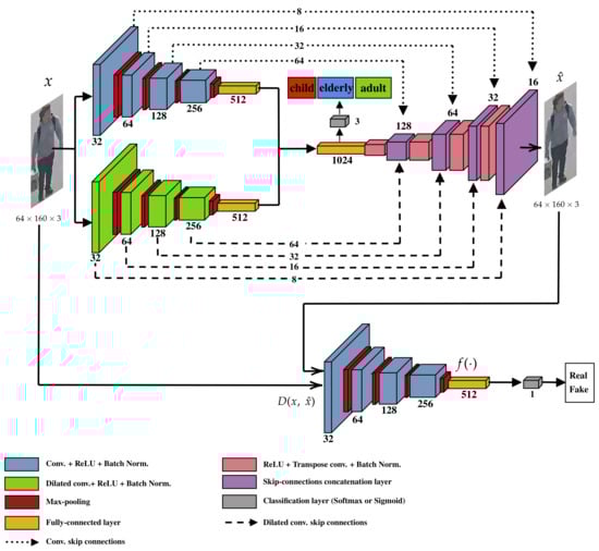 In this paper, an unsupervised anomaly detection model for different age groups of people, namely child, adults, and elderly, is proposed to achieve this goal. The proposed model has a parallel pipeline feature extractor, a conventional cascading convolutional neural network (CNN), and a cascading dilated convolutional neural network (DCN) with a dilation rate of two. At the end of both pipelines, the extracted features in the shape of fully connected layers are concatenated and then become the input for the generator, where it is used to reconstruct the original input image. The generator has partial-skip connections in a UNet-fashion [17] from both the CNN and the DCN pipeline, which allows the information from the shallow layers to propagate more efficiently to deeper layers [18] to alleviate the vanishing gradient problem, and the mode collapse [19]. Afterward, both the input image and the reconstructed output image are sent to a discriminator to be distinguished as real or fake. The discriminator’s latent vector also learns the reconstructed normal input’s latent space in the proposed scheme. The motivation to combine two sub-networks comes from the dilated convolution’s capability to extract global features without increasing the computational cost [20,21], and the combination of both the local and the global features improves the performance of the model as it was previously applied in the field of machine learning by concatenating the extracted local and global features which are then subsequently trained with traditional machine learning classifiers such as SVM [22,23]. In other words, the proposed scheme applies the same philosophy into a deep learning model by having both sub-networks extract these features automatically and then concatenate them as a result of the training. Moreover, as a part of the ablation study of the parallel encoder, supervised training is performed with a Softmax layer with three nodes added to the end of the concatenated feature vector to perform supervised classification.