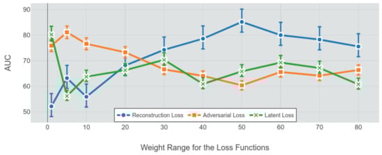 Root Mean Square Propagation (RMSProp) optimization function with parameters are used for the model training. Three separate loss functions with specific weighting, shown in Section 3, are applied. Optimal loss weighting is found to be after a grid search shown in Figure 2. Model is trained for 50 epochs until the convergence was achieved. The batch size is taken as 128. Implementation of the system is done using TensorFlow [41] (Python 3.6.9, CUDA 10.0, cuDNN 7.3). The training is done on two NVIDIA P5000 GPUs. The anomaly score introduced in [29] gives a proper indication that the input image is considered real or fake, which is given in Equation (5) below: