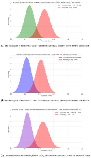Anomaly score comparison between three cases (normal-elderly vs. anomaly-child + adult, normal-child vs. anomaly-adult+elderly, normal-adult vs. anomaly-child+elderly) can be seen in Figure 4. Looking at the difference between the distributions between the normal and the abnormal cases, the proposed model is highly capable of distinguishing during the single-class anomaly detection inference.