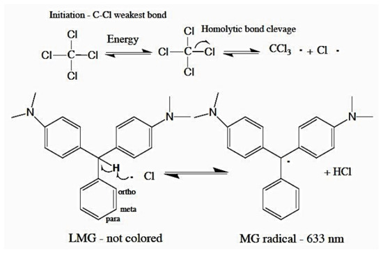 In contrast, reusability has been demonstrated in 2D radiochromic dosimeter sheets (3 mm thick) based on a PRESAGE® formulation [6] and confirmed to be usable after eight irradiations. However, the PRESAGE® 2D formulation described by Collins is not scalable to the volumes required for fabricating a 3D dosimeter equivalent formulation due to heat degradation during the curing phase of the larger volumes (>1 kg). Therefore, this study aims to evaluate in small dosimeters (cuvettes) three additional PRESAGE® formulation components from prior studies [7,8,9,10] that are known to be stable at the scales used in 3D manufacturing. The primary components of PRESAGE formulations are a triarylmethane leuco dye (TAM) and a radical initiator with the preferred containing carbon halogen bonds. Mechanistically, radicals generated after irradiation with the most labile from the cleavage of the carbon chloride bond, which reacts with the next labile bond (methine bond, central carbon) in the TAM. This reaction creates a colored resonance stabilized free radical and HCl (e.g., ca. > 600 nm) (Figure 1). The chemical structures of numerous TAMs have been evaluated in 3D dosimeters [10,11]. The density of the TAM radical is primarily on the central carbon with some charge distribution to the nitrogen substituents [10,11]. Radical stability and sensitivity are primarily due to steric protection of the central carbon and to polar solvents such as dimethyl sulfoxide. These factors influence the equilibrium between the radical (colored TAM) and the colorless starting leuco dye. The three TAMs, along with their formulations, are shown in (Table 1). Structures 1 and 2 were chosen because the methine is structurally hindered, which is reflected in the post-irradiation color stability of over 500 h with 4% solvent in the formulation, while the color is bleached after 320 h when formulated with 15% solvent [10,11].