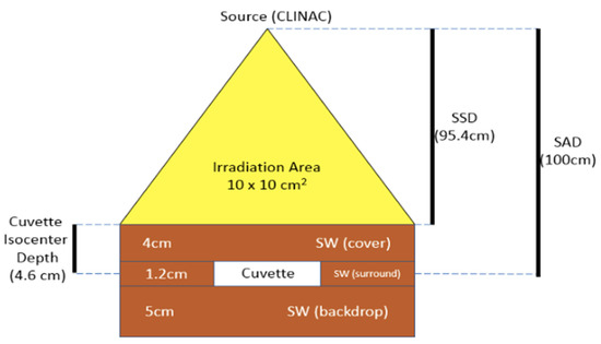 Cuvette irradiation setup. The cuvette was placed on top of a 5 cm thick backdrop of solid water and then surrounded by a solid water layer 1.2 cm thick. An additional 4.0 cm thick layer of solid water was then used to cover the cuvette. The center of the cuvette was moved to the isocenter at SAD = 100 cm. The SSD (source-surface distance) is set to 95.4 cm. The collimator field size is 10.0 × 10.0 cm2.