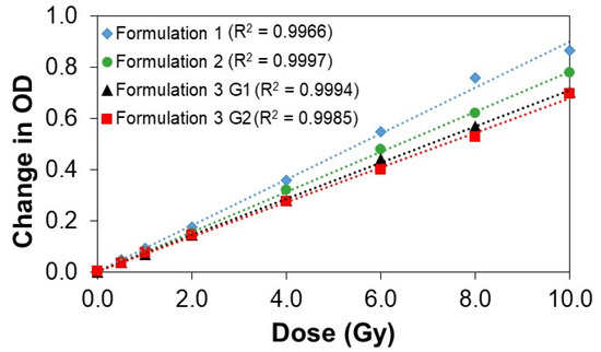 The OD response to irradiation for all three formulations displays a linear relationship (Figure 3) with R2 coefficients ranging from 0.9966 to 0.9997. The linearity of response to radiation suggests that all three formulations are viable candidates for use as a dosimeter for at least a single irradiation.