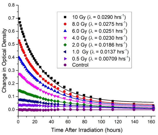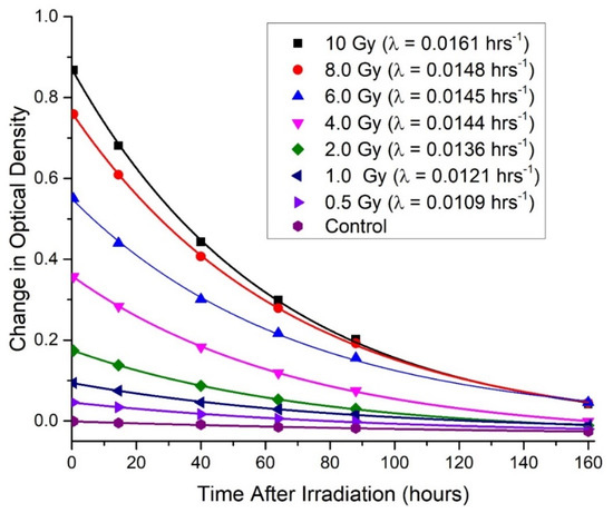 The clearing data for initial irradiation of seven cuvettes of Formulation 1 (Figure 4), Formulation 2 (Figure 5), and Formulation 3 (Figure 6) are shown for all doses. The data were fit with an exponential decay curve to determine a time constant for the exponential decay. The fit equations are y = y0 + Ae−λt, where A is the immediate post-irradiation OD and y0 is the decay baseline. The goal was not to determine a high precision time constant but rather to gain a general understanding of how long the cuvettes require to return to a stable baseline to be reused for dosimetry measurements.