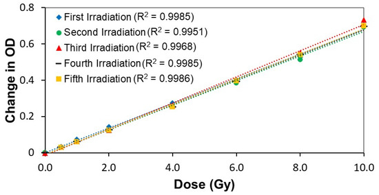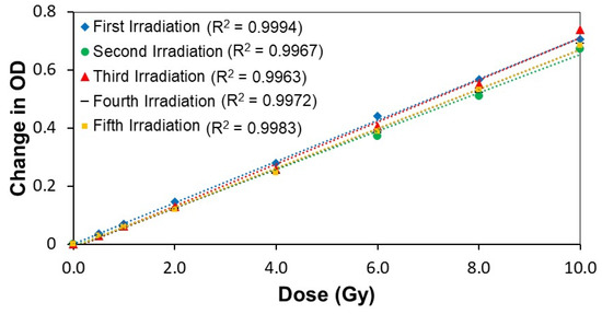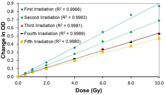 Figure 7 and Table 2 show that the calibration curve slope decreases upon reirradiation of Formulation 1, displaying a decrease in sensitivity after each subsequent irradiation. For example, the second and third irradiations showed significant drops in sensitivity (24% and 40%, respectively) from the initial irradiation. Still, the subsequent irradiations showed much more minor changes from the previous irradiation. In other words, the dose sensitivity decreases upon reirradiation, while the linearity is maintained with mean absolute percentage errors (MAPE) (Table 3) ranging from 1.2% to 4.5%.