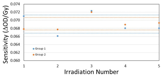 Figure 10 shows the measured sensitivity values of all five irradiations of Group 1 and Group 2 of Formulation 3 cuvettes plotted together, with the one population standard deviation bands included to show the level of agreement between the two data sets. The average sensitivity for Groups 1 and 2 was 0.0691 ± 0.0023 ∆OD/Gy and 0.0691 ± 0.0015 ∆OD/Gy, respectively, with the uncertainty values representing one population standard deviation. Thus, all measured sensitivities were within two population standard deviations of the average.