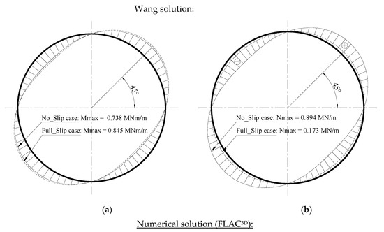 Figure 4 illustrates the distribution of the incremental internal forces induced in the tunnel lining under seismic loading. The conditions of lining and soil interaction, when using the Wang solution and FLAC3D, were considered for both cases of no slip and full slip. The soil and tunnel lining parameters fed into the model are presented in Table 1. The results obtained by numerical and analytical models are in good agreement. Figure 4a,c show that the maximum incremental bending moment in the full-slip case is 14% larger than that obtained in the no-slip case. In contrast, the maximum incremental normal forces in the full-slip case are smaller than those in the no-slip case (Figure 4b,d).