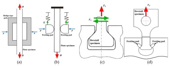 The most effective method to study the behavior of fretting fatigue is a fretting test. The American Society for Testing and Material (ASTM) committee passed the “Fretting Fatigue Test Standard Guide” [5], which summarizes the current research status in the field of fretting testing. In general, previous studies explored two popular forms of structure for fretting fatigue tests involving the typical plane-type [6,7,8,9,10] shown in Figure 1a,b, and the dovetail-type [11,12,13,14] shown in Figure 1c,d.