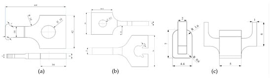 Dimensions of the specimen. (a) Dovetail specimen; (b) clamp; (c) fretting pad specimen. (Unit: mm).