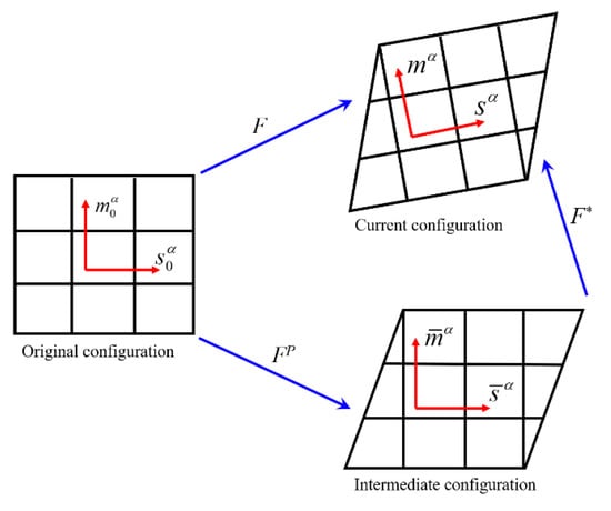 The multiplicative decomposition of the deformation gradient in Figure 4 shows a free stress configuration during the deformation process of the deformable body from the reference configuration to the current configuration. This free stress configuration contains only the deformation caused by the plastic slip, which is the intermediate configuration. The intermediate configuration only contains plastic slip deformation, and the dislocation plastic slip does not change the orientation of the crystal grains, which can be described as: