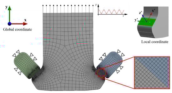 To simplify the scale of the finite element model, only the dovetail specimen and two fretting pads are meshed in the ANSYS program. Besides, only the local elements near the contact surfaces are refined to ensure the accuracy of contact calculation. Figure 5 depicts the boundary conditions and the load application in the finite element model in the global coordinate system, as well as the exact mesh at the contact surfaces. The local coordinate system of x’-y’-z’ is established based on the contact surface. The fatigue load is applied on the top of the dovetail specimen in a type of sine wave. Fixed supports are applied on the three side surfaces except for the contact surface of each fretting pad.
