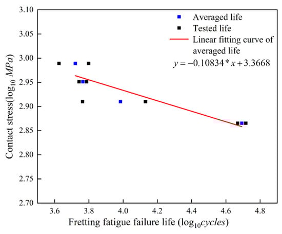 Although the fretting fatigue life can be divided into two stages of crack initiation life and propagation life, there is no widely accepted standard to distinguish the two stages [14,21]. Since the period from crack initiation to fracture is too short to capture, the present study does not distinguish the above two stages and only considers the overall fretting fatigue failure life. The experimental results of eight dovetail specimens are summarized in Table 7. It is clear that the fretting fatigue failure life decreases with the increase of the maximum load. The relationship between the experimental fretting fatigue failure life and the contact stress is shown in Figure 6 in logarithmic coordinate. The contact stress here can be obtained through dividing the maximum experimental load by the effective contact area, which is a concept of nominal compressive stress. The effective contact area of the dovetail specimen depends on the inclined angle (45°) of the contact surface shown in Figure 2a. A linear function is fitted to match the relationship between the experimental fretting fatigue failure life and the contact stress (R2 = 0.837):
