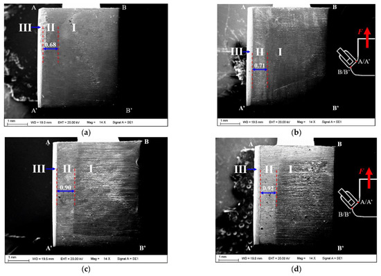 The two representative fracture failure modes for the dovetail specimens are shown in Figure 7. The red dotted line in Figure 7a,b represents the crack direction at the crack initiation and propagation stage. The position of the initial crack is at the upper edge of the contact surface based on the local coordinate system. The direction is almost perpendicular to one of the contact surfaces for the dovetail specimen, which is along the -z’ direction of the local coordinate. Although the two contact surfaces of one dovetail specimen have the same contact state and stress distribution theoretically, due to the roughness errors of the contact surface in the machining process fretting fatigue cracks start to initiate from the surface with larger stress.