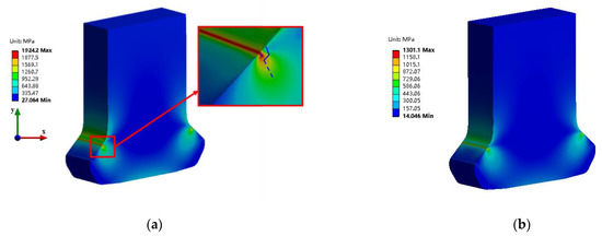 Stress distribution of dovetail specimen (13,500 N). (a) Von Mises stress; (b) maximum shear stress.