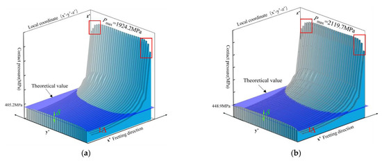 The theoretical values of contact pressure are marked as a blue plane in Figure 12. The plane for the theoretical value intersects the numerical contact pressure distribution curves at two end areas. The pressure distribution at the right end is considerably higher than the theoretical value due to the stress concentration. The left end is only slightly higher than the theoretical value, as shown by δ in Figure 12. Moreover, in the middle of the distribution curve, the theoretical value is greater than the numerical results for the contact pressure, as shown by Δ. This phenomenon is due to the larger contact pressure in the upper contact area resulting in a larger strain, which destroyed the originally uniformly distributed contact pressure, leading to the numerical result of the middle area being smaller than the theoretical value. As a result, more severe fretting wear at the upper edge causes the fretting crack initiation and propagation, which is consistent with the experimental results (Figure 7 and Figure 10).