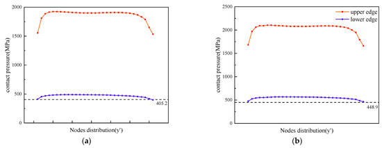 Peak pressure distribution at the upper and lower end of the contact surface. (a) 13,500 N; (b) 16,451.6 N.