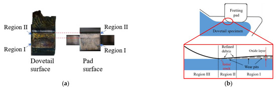 It is reported from [14] that the specimen surface can be divided into three regions according to damage mechanism theoretically, namely, the stable wear region (Region I), crack initiation region (Region II), and undamaged region (Region III), as shown in Figure 14b. In this study, three regions can be easily distinguished from the SEM observations in Figure 9, reflecting a high degree of unity between theoretical analysis and experimental results. Moreover, the width of Region II increases slightly as the fatigue load increases. In addition, the intensification of fretting wear will result in the thinning and shedding of the oxide layer on the contact surface. In the SEM observation results of Figure 10 and the pictures of specimens in Figure 14a, the color of Region II is lighter than that of Region I. Therefore, it is obvious that the thickness of the oxide layer has been significantly reduced in Region II due to the dramatically changing stress state, which is consistent with the analysis of fretting fatigue mechanism in [14].