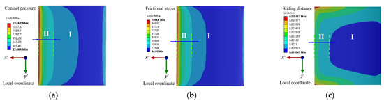 Contact state of the contact surface for the numerical results (13,500 N). (a) Contact pressure; (b) frictional stress; (c) sliding distance.
