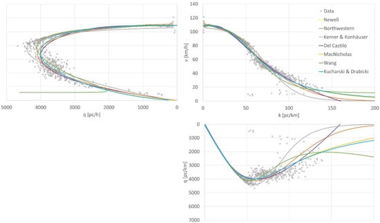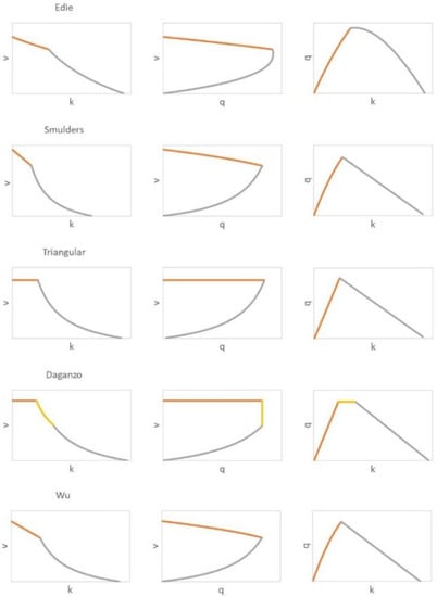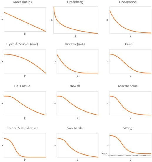 Most of the above criteria can also apply to models of the fundamental relationship. What makes a good traffic flow model? According to Wang et al. [4], it should have a simple functional form (be “mathematically elegant”), fit the data well, have interpretable parameters, and allow the entire range of traffic conditions to be modeled. The latter suggests that a single-regime model is preferred over a multi-regime model, which is confirmed in the works of MacNicholas and Underwood [9,18]. In principle, the criteria given by MacNicholas and Underwood are consistent with those identified by Wang. MacNicholas mentions an additional aspect of having to meet boundary conditions. Underwood, on the other hand, points out that the model should easily lend itself to mathematical analysis and that its limitations should be known in advance.