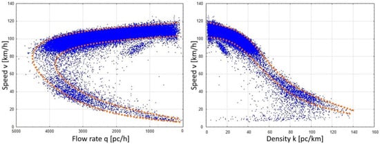 Empirical data are shown in the fundamental diagram (Figure 3). They are represented by the scattered cloud of empirical data for the entire range of traffic conditions. The phenomena are reported by many studies and explained by e.g., heterogeneity of drivers, non-stationary dynamical features of traffic flow, randomness in individual driving behaviors, and errors in measurement methods or data processing [32,33,34,35]. The existence of the scatter raises some questions: What should be the functional form of the deterministic model to ensure the highest empirical accuracy? Should it be represented by a single or multi-regime model? How to estimate boundary parameters and what should be their values?