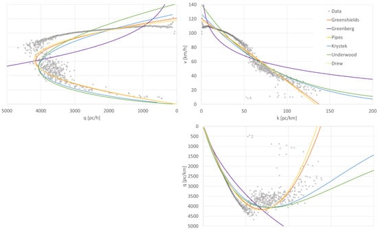 There is also a group of models (with v = f(q) BPR function [20] as an example) that represent the speed–flow–density relationship for a free-flow regime only and do not consider traffic flow characteristics after the maximum flow and corresponding optimum density are reached. It is not a limitation if the purpose is to analyze traffic under free-flow conditions; however, to estimate values of traffic flow parameters at the maximum flow (), some initial assumptions regarding the boundary of the free-flow regime need to be made. As a result of these reasons, these kinds of models are not included in Table 1.