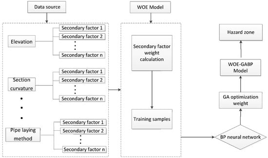 Risk assessments are affected by many factors; however, the dimensions, magnitudes, and evaluation indicators of each factor are different. To determine the accuracy of the final assessment combination, it is essential to understand the influence of the organic combination of each factor quantitatively reflected in the risk assessment. There are two primary methods for determining pipeline risk evaluation indicators: one is based on expert ratings and system safety theory [8,9,10], and the other is based on membership functions and fuzzy mathematics [11,12]. Methods of pipeline risk assessments can also be divided into two categories: evaluation through a simple qualitative method [13,14] and a semi-quantitative evaluation using a computer [15,16,17,18,19,20]. Although semi-quantitative evaluations can improve the subjective nature of qualitative evaluations, each factor’s weight is primarily based on the analytic hierarchy process, which is influenced by human subjectivity. The weight of evidence (WOE)—genetic algorithm (GA)—backpropagation (BP) model is an information evaluation method supplemented by a BP neural network optimised by a GA, which can eliminate the influence of subjectivity on the weight of each factor, ensuring more objective evaluation results. In this study, the Sichuan-East Gas to Sichuan-Chongqing and Western Hubei pipeline route was considered as the research subject. Based on the survey data of on-site geological disasters, the WOE model was used to assess the danger along the pipeline, and then the BP neural network was employed to study the weight of each factor. Finally, based on the geographic information system (GIS), a geological disaster risk zoning map was obtained along the pipeline. The receiver operating characteristic (ROC) curve was utilized to verify the reliability of the model and to provide reference information for other long distance pipelines.