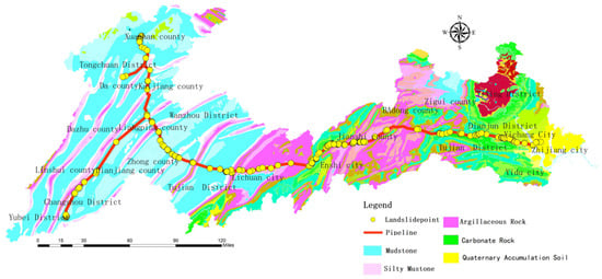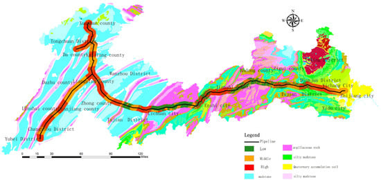 The pipeline trunk line of the study area is 660 km long and passes through multiple stratigraphic sub-regions of Dazhou City, Chongqing City, Enshi Prefecture, and Yichang City. Controlled by geological structures, the strata along the pipeline have complex lithologic characteristics and diverse rock mass types. Mudstone, limestone, clastic rock, and carbonate rock are the main rock types in this region. From west to east, it passes through the third subsidence zone of the New Cathaysian System and central zone of the Yangtze Quasi-platform. It belongs to a subtropical humid monsoon climate zone, characterized by cold winters, hot summers, heavy rains in spring and autumn, high humidity, and abundant rainfall. The average temperature is 15–17 °C. The landforms along the route are river valleys, hills, and mid-mountain landforms; accompanied by numerous geological disasters such as collapses, landslides, and unstable slopes (Figure 3).
