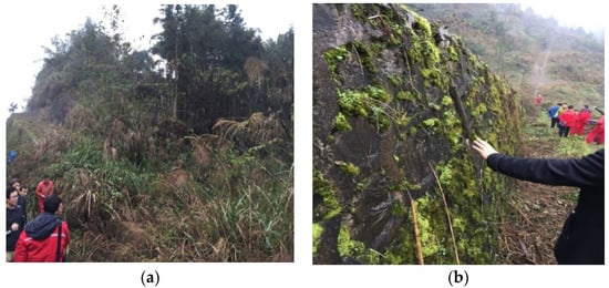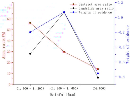 The effects of rainfall on landslides are reflected in several aspects. First, rainwater penetrates into fracture surfaces or cracks due to gravity, which reduces the frictional resistance between the contact surfaces. In addition, water content significantly affects the mechanical properties of the soil. When the sliding force is greater than the anti-sliding force, the slope becomes unstable. Based on the national average rainfall distribution map in 2018, the rainfall amounts in the study area were divided into three categories: 1000–1200 mm, 1200–1600 mm, and >2000 mm (Figure 9).