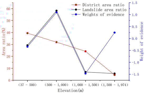 The development of landslides is closely related to their distribution elevation. On the one hand, the terrain gradient is different at different elevations, which results in a difference in the collecting capacity of surface water. On the other hand, the intensity of human engineering activities is different in different elevation ranges, which results in a difference in surface conditions; hence, elevation is an important factor in the landslide disaster-inducing environment. The elevation range of the study area is 17–1937 m, of which more than 95% of landslides are distributed in the range of 17–1500 m, with no landslides beyond 1500 m. According to the actual distribution, the elevations are 37–500 m, 500–1000 m, 1000–1500 m, and 1500–1974 m. A total of five secondary states constitute the number of grids in each region, number of geological hazard points in each region, and number of grids occupied by geological hazard points (Figure 5).