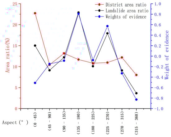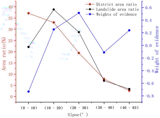 The slope affects surface water collection, groundwater infiltration, groundwater flow direction, and stress distribution, and consequently, the gestation and development of landslides. Therefore, slope is an important factor that affects the occurrence, development, and morphological characteristics of landslides. The slope of the terrain in the study area ranged from 0° to 83°, and landslide slope was distributed between 0° and 30°, accounting for nearly 90% of the area. The slope was discretised with a step length of 10°, and the landslide area ratio in each secondary state, classification area ration, and WOE were calculated (Figure 6).