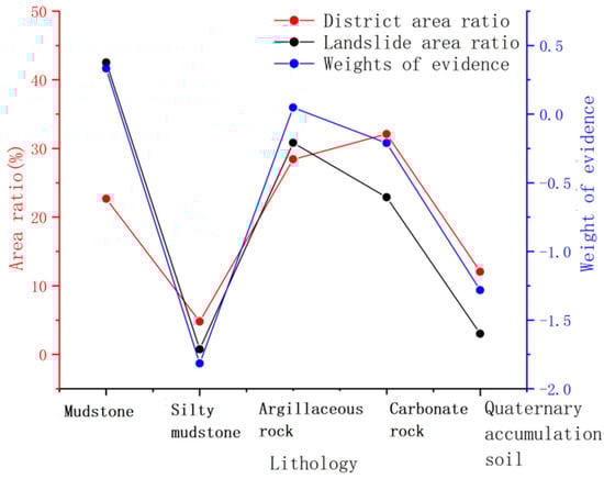 The stratum plays an important role in landslide formation and development. However, different types of engineering geological rock groups have different degrees of influence on the formation of landslides and other geological disasters. Moreover, engineering geological rock sets determine the type and scale of landslide characteristics. Based on the national 1:50,000 geological map and a previous investigation, the lithology of the study area was divided into five types: mudstone, silty mudstone, argillaceous rock, carbonate rock, and quaternary accumulation soil, and the statistics of the lithology landslide area ratios were evaluated, among other quantities (Figure 8).