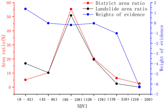 The vegetation coverage rate significantly affects the stability of the slope. On the one hand, vegetation coverage reduces the ground runoff and rainwater infiltration along with the effects of rainfall on slope stability. On the other hand, vegetation roots can reinforce slopes and increase slope stability. Based on Landsat8 images, the NDVI index in the study area was extracted in this study to elucidate its effect (Figure 10).