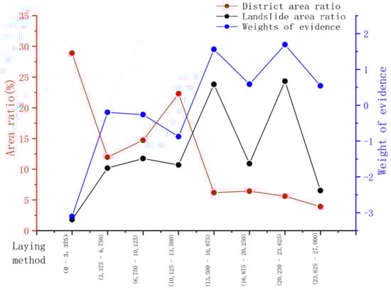 Index factors are divided into discrete and continuous types based on the degree of influence on the landslide. For continuous data, the factors are first discretised; for discrete data, each grade has a clear physical significance. The degree of influence of the secondary state of each indicating factor on landslides was evaluated by the landslide area ratio, graded area ratio, and evidence weight [30]. The landslide area ratio is the landslide area occurring in the secondary state of the index factor compared to the total landslide area in the entire region, and the graded area ratio is the area of each secondary state of the index factor compared to the total area of the index factor. The relative size of the two ratios characterises the importance of the secondary state classification of the index factor for landslide susceptibility [31]. If the landslide area ratio is greater than the graded area ratio, the landslide is prone to occur within the classification of the state, which is a rare occurrence.