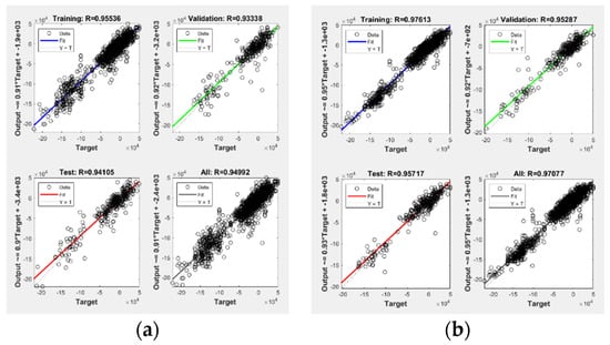 Correlation coefficients of neural network training: (a) BP and (b) GA-BP.