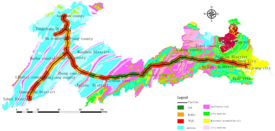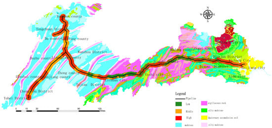 In recent years, many scholars have conducted research on pipeline stress and strain, limit state [2,3,4,5], monitoring, and early warning [6,7] during landslides; most of them focusing on pipeline stress analysis without considering the mechanical behaviour of different laying methods through quantitative analyses in pipeline risk assessments. Pipeline risk assessments include two aspects: a vulnerability assessment of geological hazards along the pipeline and a vulnerability assessment of the pipeline.