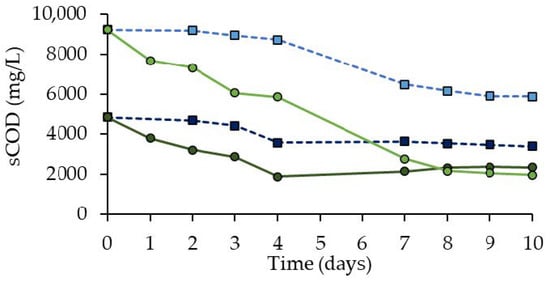 The evolution of sCOD concentration during the fungal treatments is shown in Figure 1.