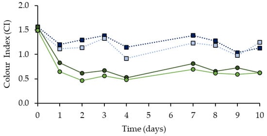 AL waste has a dark brown colour, so its decolourization is important to avoid negative environmental and visual effects. Highly coloured wastewater reduces the passage of light through the water, causing a reduction in photosynthetic activity and, therefore, altering the flora and fauna of the water []. The colour index profile is shown in Figure 5. Greater removals were obtained when the fungus was added.