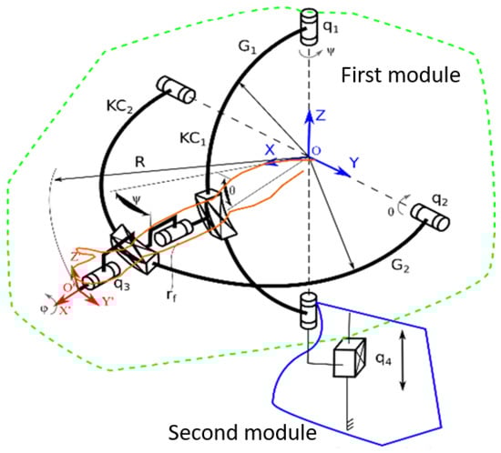 ASPIRE is a parallel robot for shoulder rehabilitation, whose design is outlined in []. The robotic structure is based on a spherical architecture, and it is capable of performing flexion, extension, adduction, and abduction of the shoulder. The system is also able to perform the pronation and supination of the forearm. The kinematic scheme of ASPIRE robotic structure is presented in Figure 1 []. The robot is composed of two modules: the first module is the one containing tools for performing the shoulder rehabilitation procedure (one axis for each rehabilitation motion). The OXYZ reference system indicates the center of shoulder joint, and all rehabilitation motions are described using this point. The adduction-abduction motion is performed using the q1 axis that rotates a circular guide (G1) attached to circular guide G2 using a passive revolute joint (rf). The flexion-extension motion is performed by q2 axis that rotates the circular guide G2. The interconnected circular guides impose a spherical trajectory of O’X’Y’Z’ reference system with respect to the shoulder joint center. The pronation-supination motion is performed using axis q3 that reorients the O’X’Y’Z’ reference system around X’ axis.