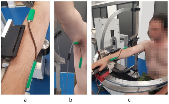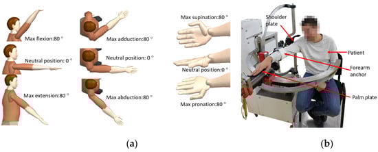 The second module is used for adjusting the rehabilitation mechanisms based on patient height and it contains one axis (q4) that displaces vertically the OXYZ reference system of the structure. The motion amplitudes for each rehabilitation motions are ±80 degrees [] and the limb positions during the rehabilitation may be seen in Figure 2a. During the rehabilitation procedure, the patient is seated, and his right shoulder is pressed against the shoulder plate of the robot; the forearm is attached within the forearm support. His palm is placed on the pronation-supination mechanism and held in place by an elastic band as it can be seen in Figure 2b where the experimental model of the ASPIRE is presented.