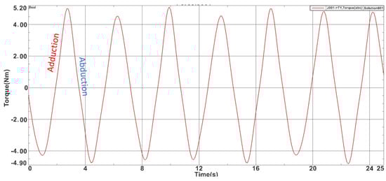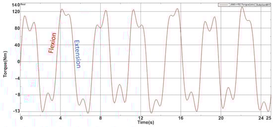 For the flexion-extension module, a 25-s simulation was carried on and the max torque obtained was 127.202 Nm while the minimum value was −13.231 Nm. Figure 5 represents the time-based torque variation during the simulation.