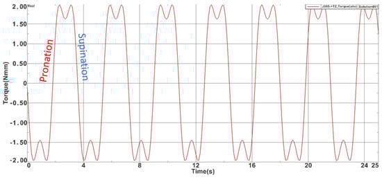For the adduction-abduction module also a 25-s simulation was carried on and the max torque obtained was 5.040 Nm while the minimum value was −4.81 Nm. Figure 6 represents the time-based torque variation during the simulation. For the pronation-supination module the max torque obtained was 1.91 Nm while the minimum value was −1.89 Nm. Figure 7 represents the time-based torque variation during the simulation.